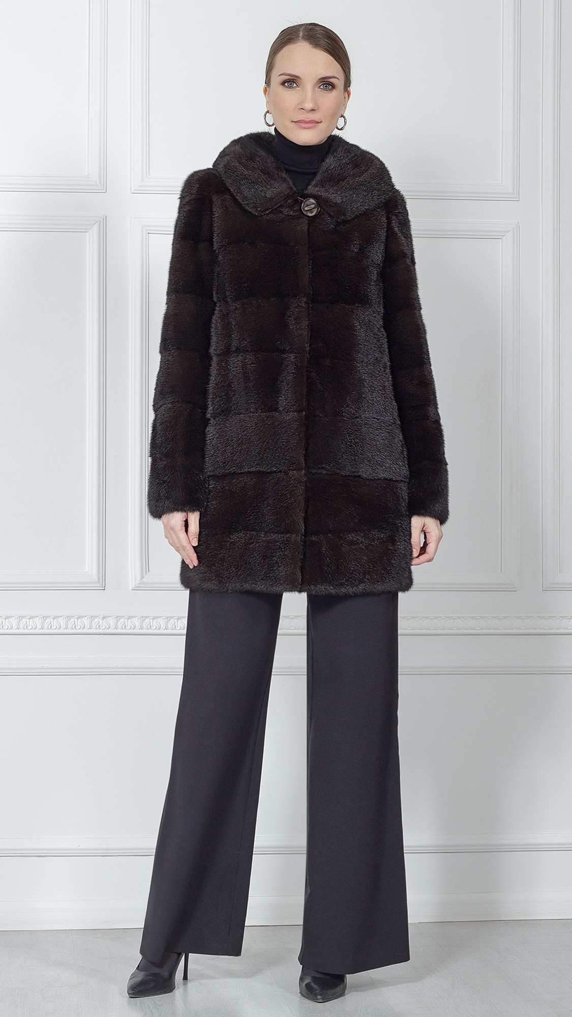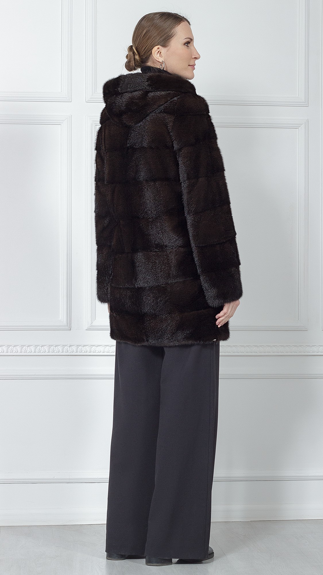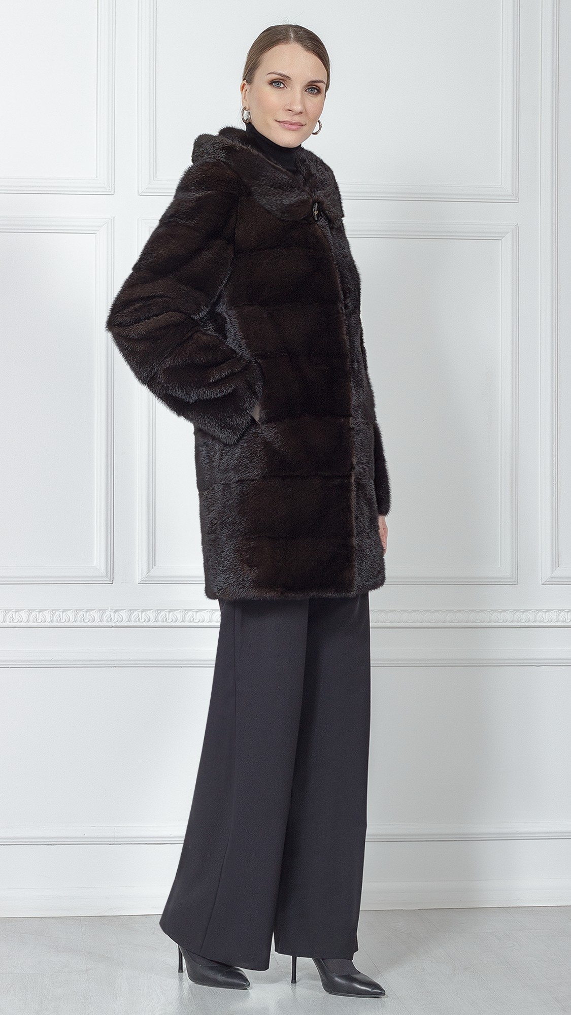 Классическая норковая шуба поперечного кроя будет очень кстати к любому зимнему образу. С ней получается невозможное: выглядеть красиво и не мерзнуть — обратите внимание на комфортный капюшон и длину 90 см. К тому же, богатый темно-коричневый цвет подойдет к любому гардеробу.
