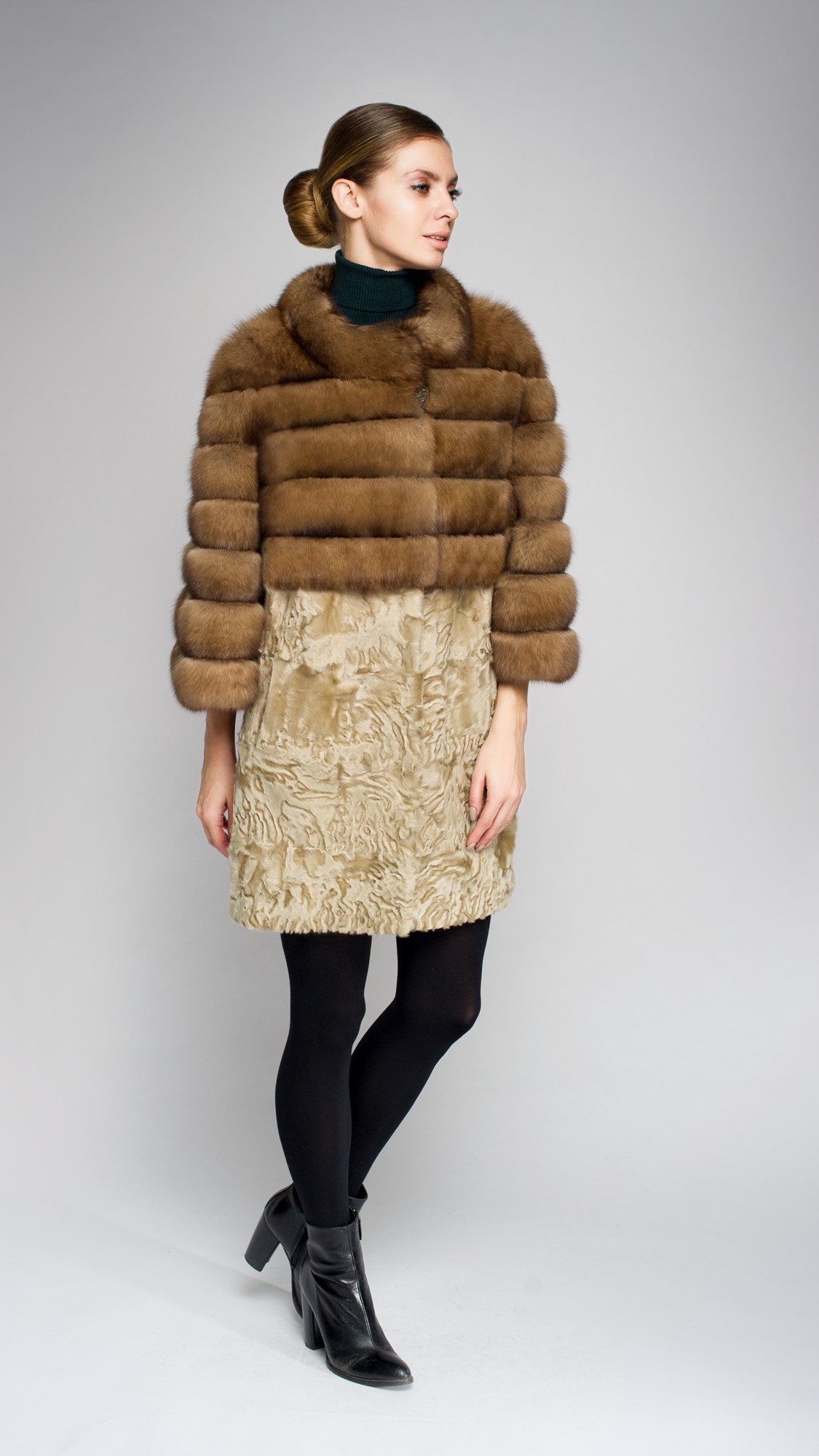 Два роскошных меха в одном оттенке идеально дополняют друг друга. Благородный соболь и узорчатый каракуль, расклешенные рукава и универсальный прямой фасон. Такая модель классно сядет на любую фигуру и гармонично впишется в женственный образ с каблуками и маленькой сумочкой.