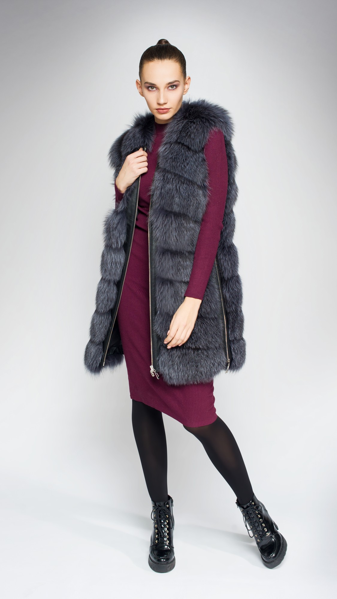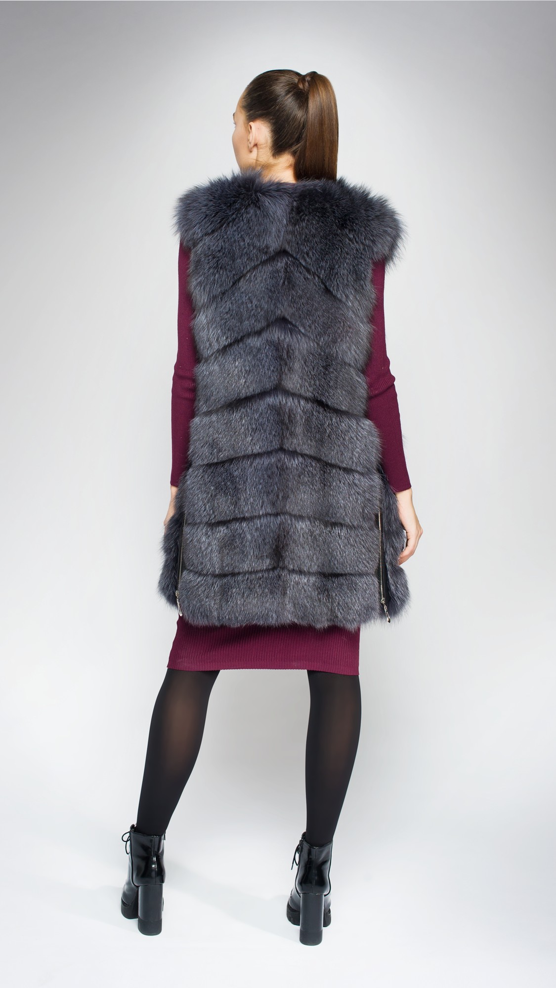 Темно-серый мех блюфроста изумительно подходит для этой модели удлиненного жилета. Поперечный крой и приталенный силуэт позволяют комбинировать его с чем угодно. К тому же, объемный и пушистый мех позволит широко экспериментировать с аксессуарами и яркими акцентами.