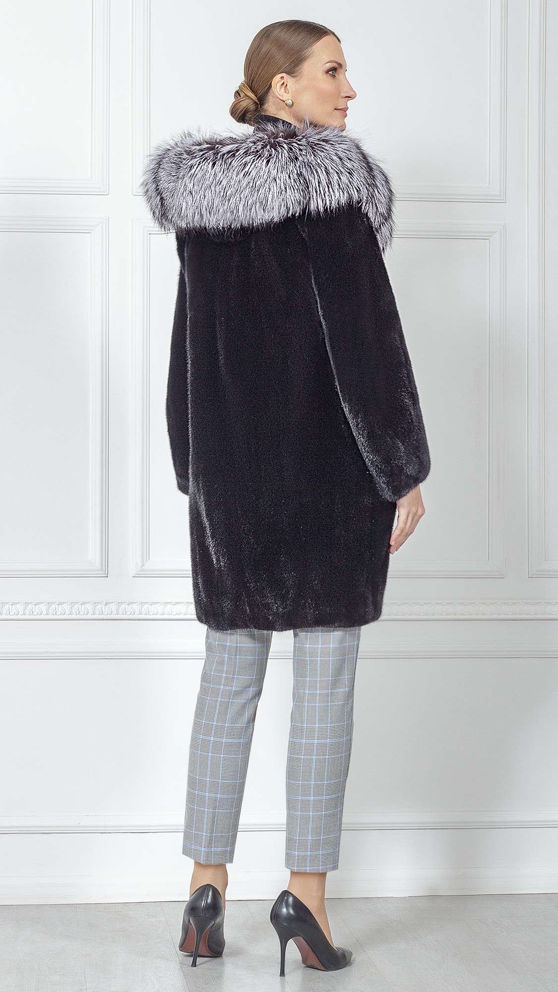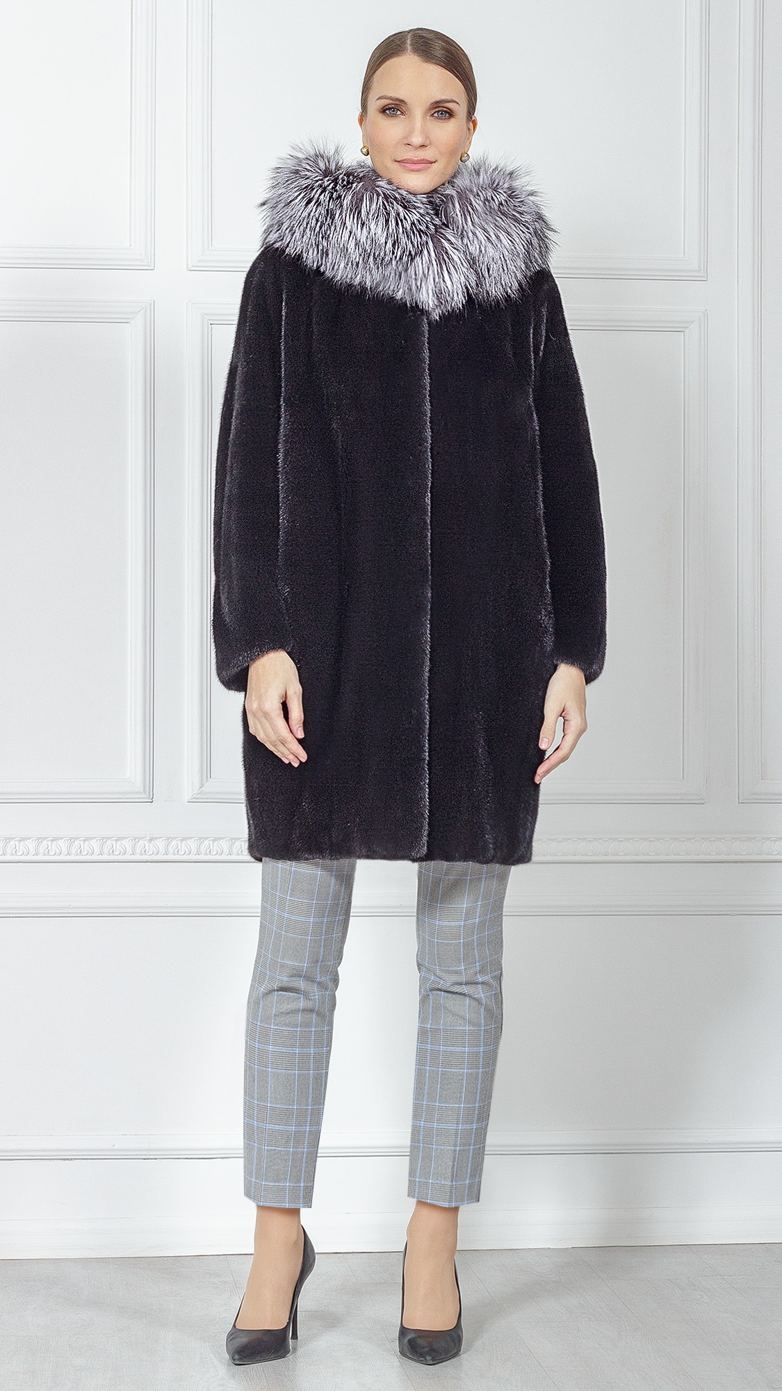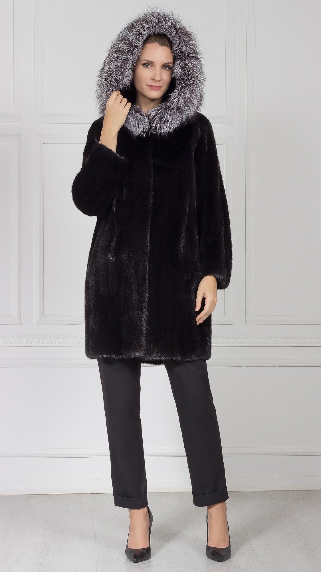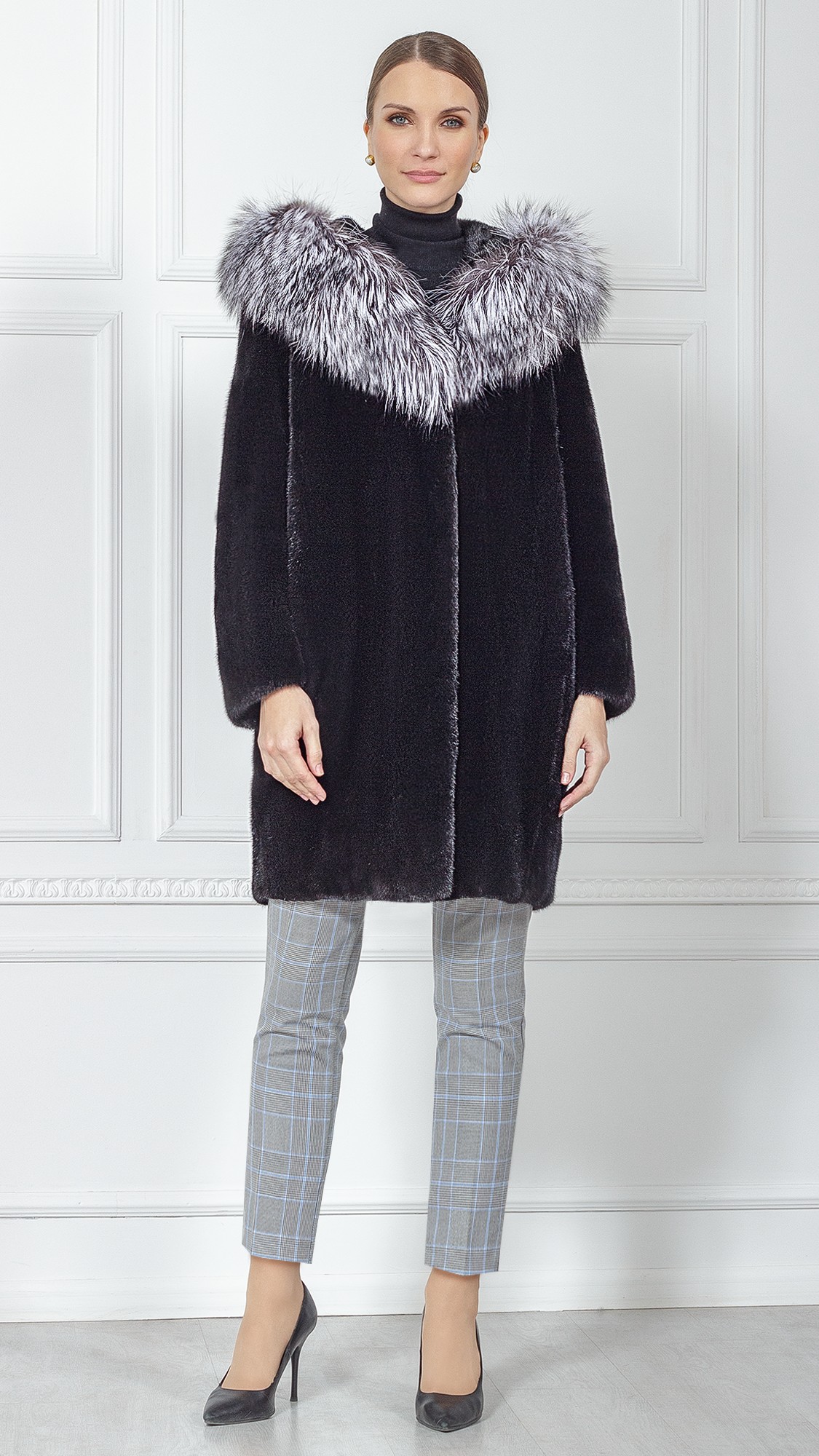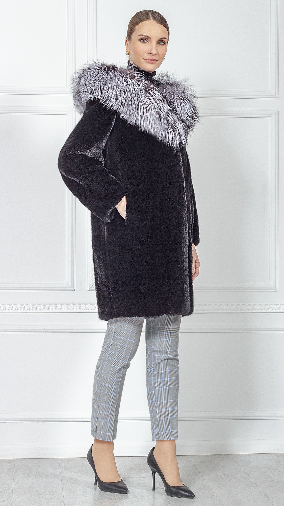 Шуба из меха норки, отделка чернобурая лиса