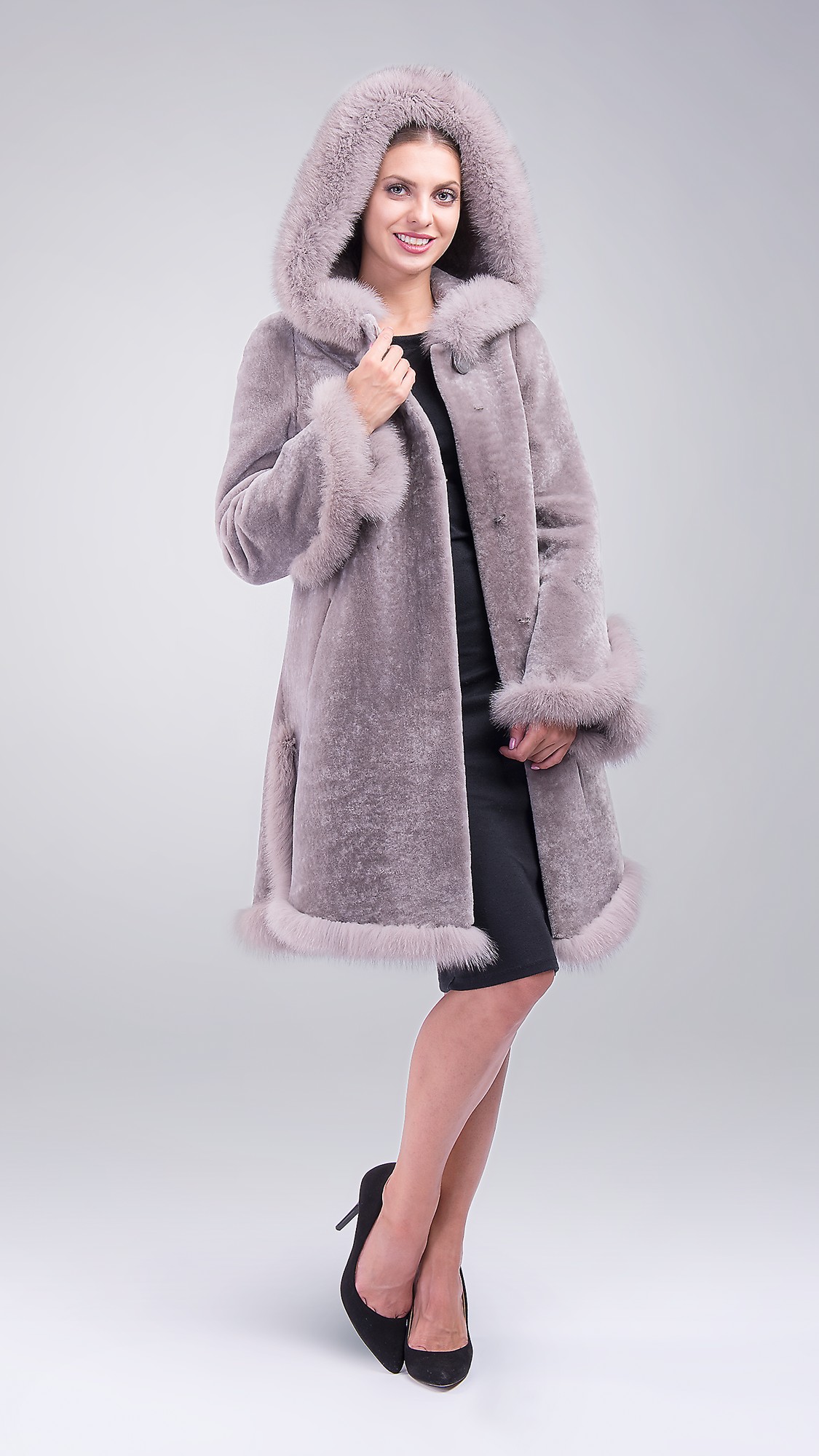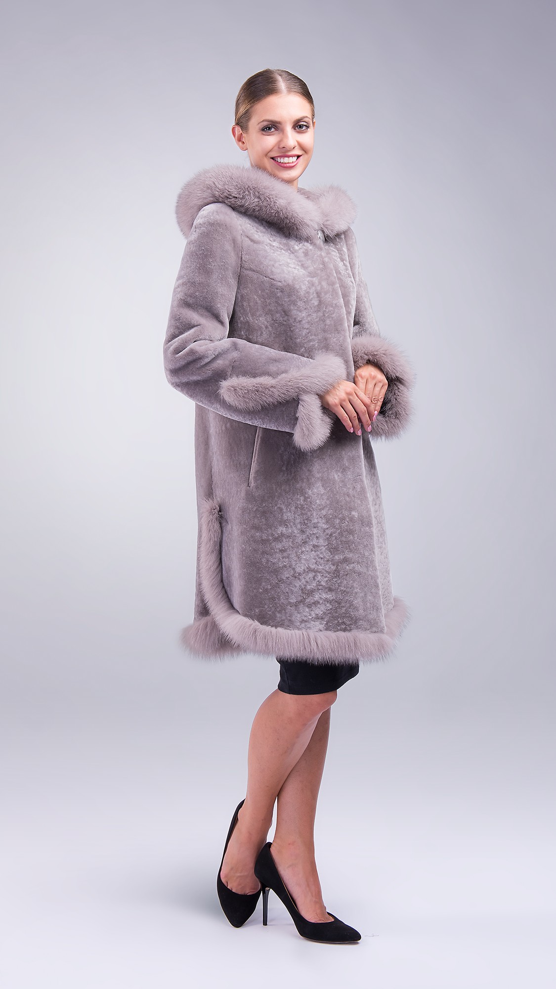 Шуба из овчины с отделкой из пушистого песца в тон разбавит скучные оттенки в гардеробе. Интересный капюшон, манжеты и низ модели отлично оттеняют простой крой. Необычный нежно-лиловый цвет точно выделится среди черной и коричневой классики.
