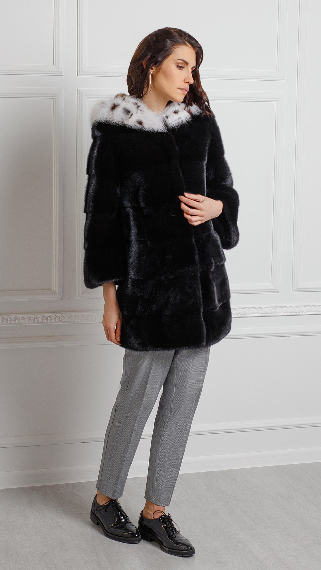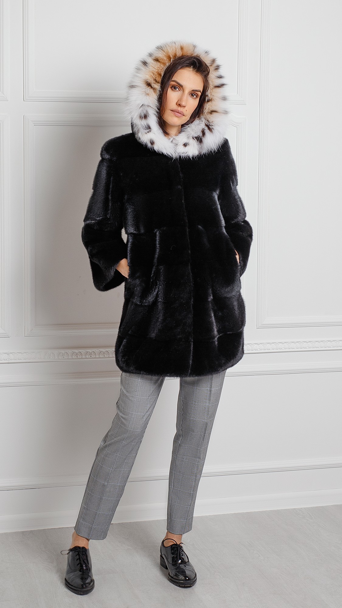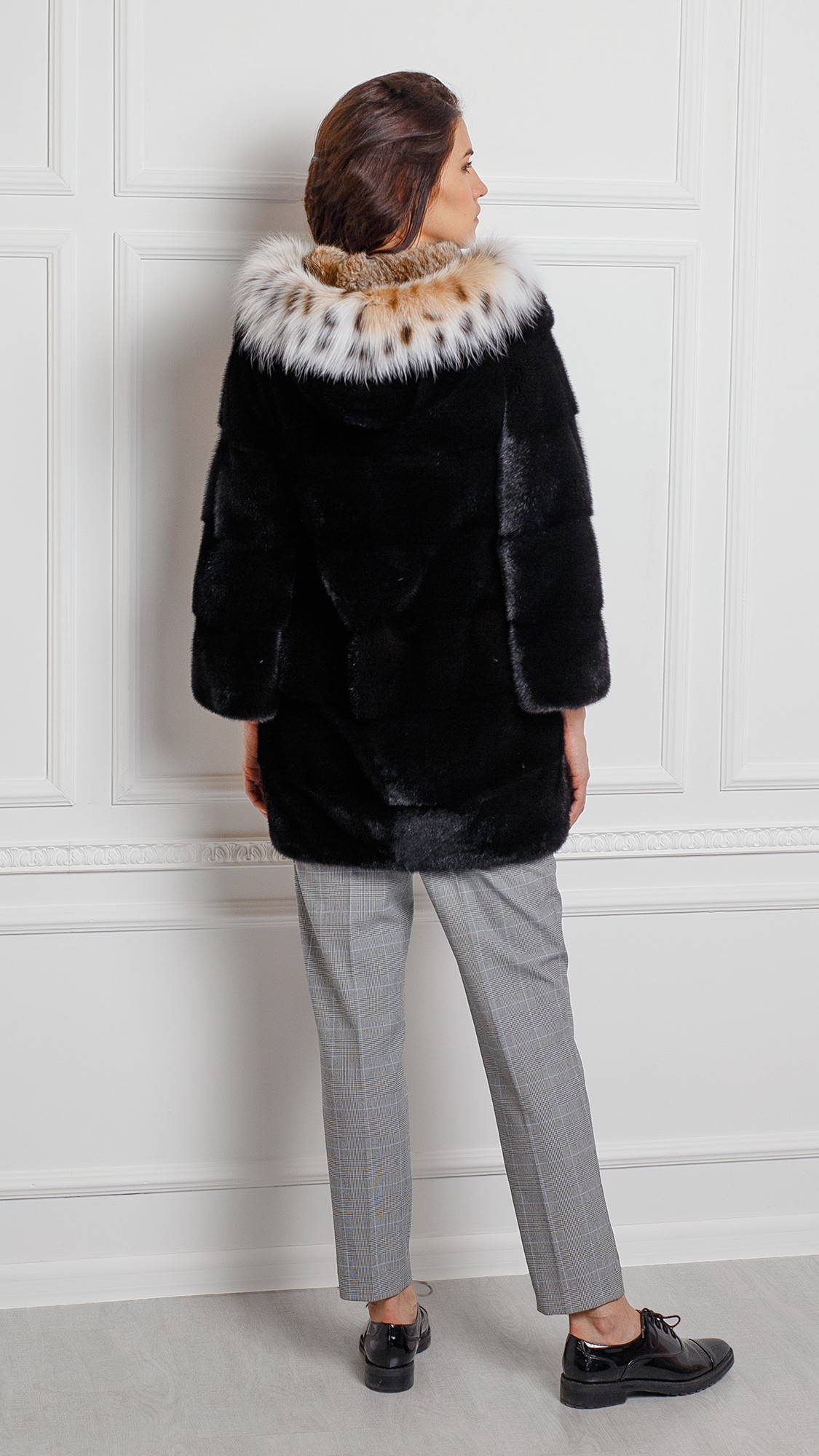 Шуба из меха норки, отделка рысь