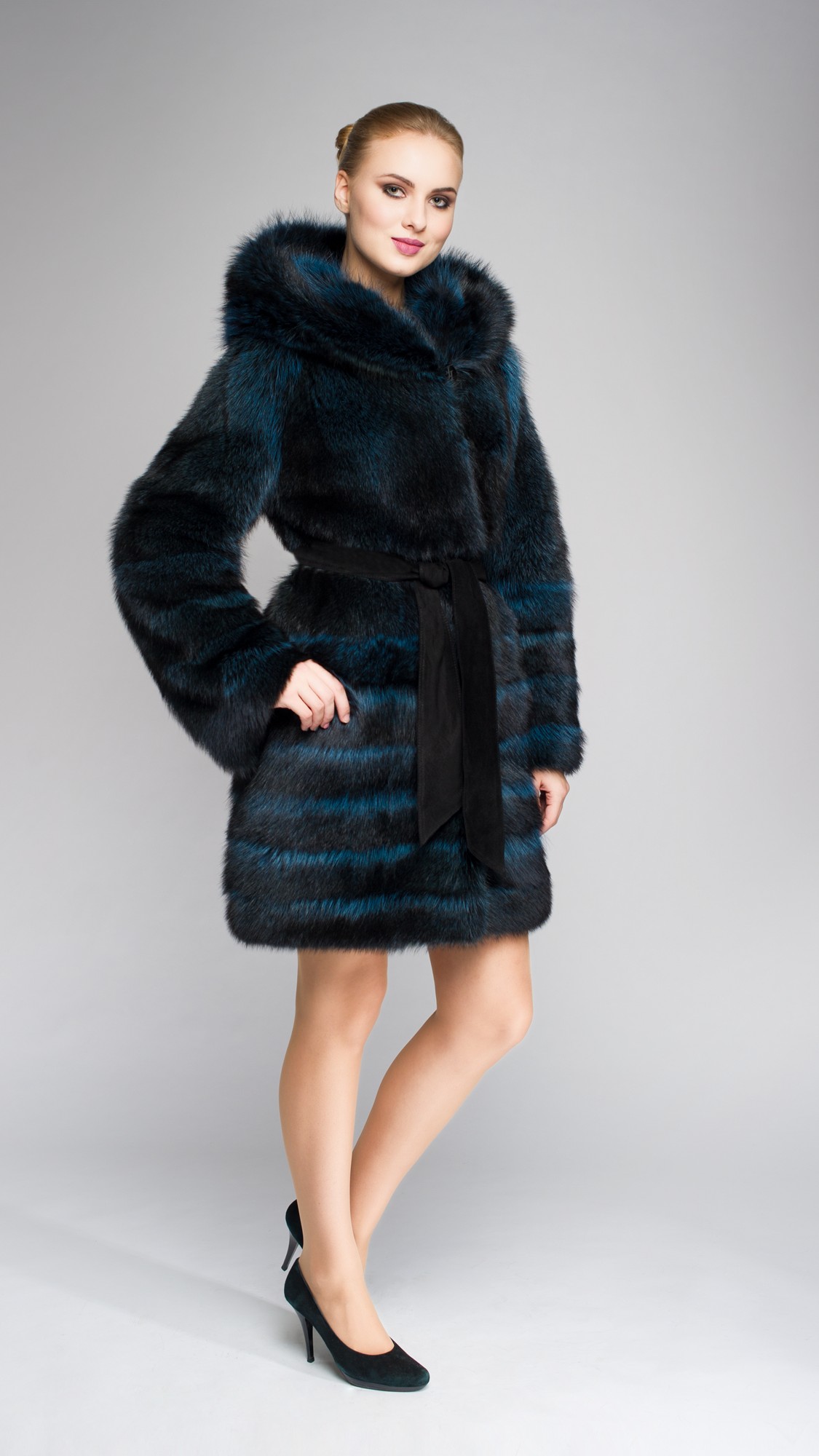 Необычная шуба из енота прекрасно подойдет практически к любой одежде. Пусть вас не смущает легкий изумрудный оттенок — он не помешает сочетать такой верх с разными оттенками.