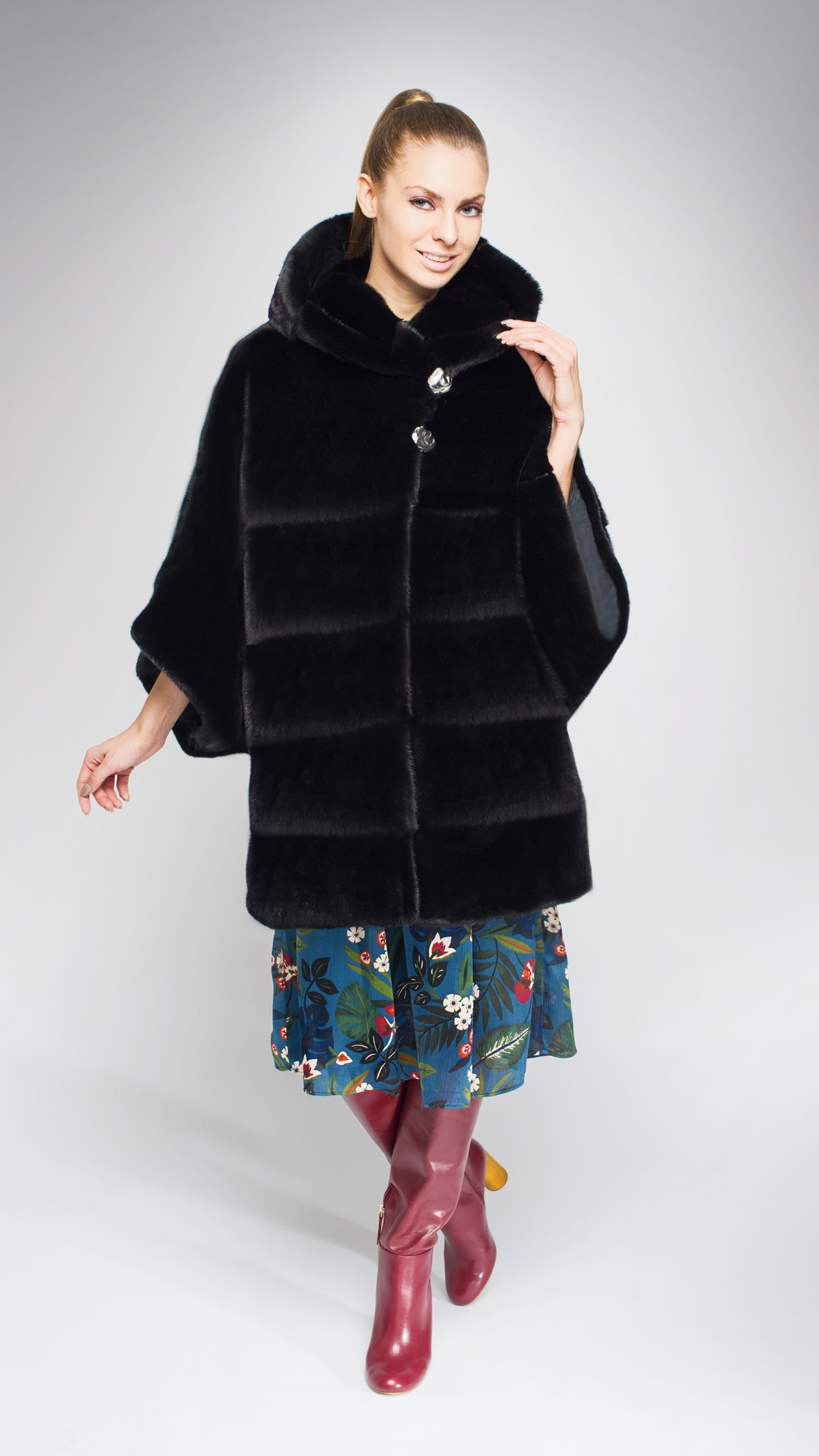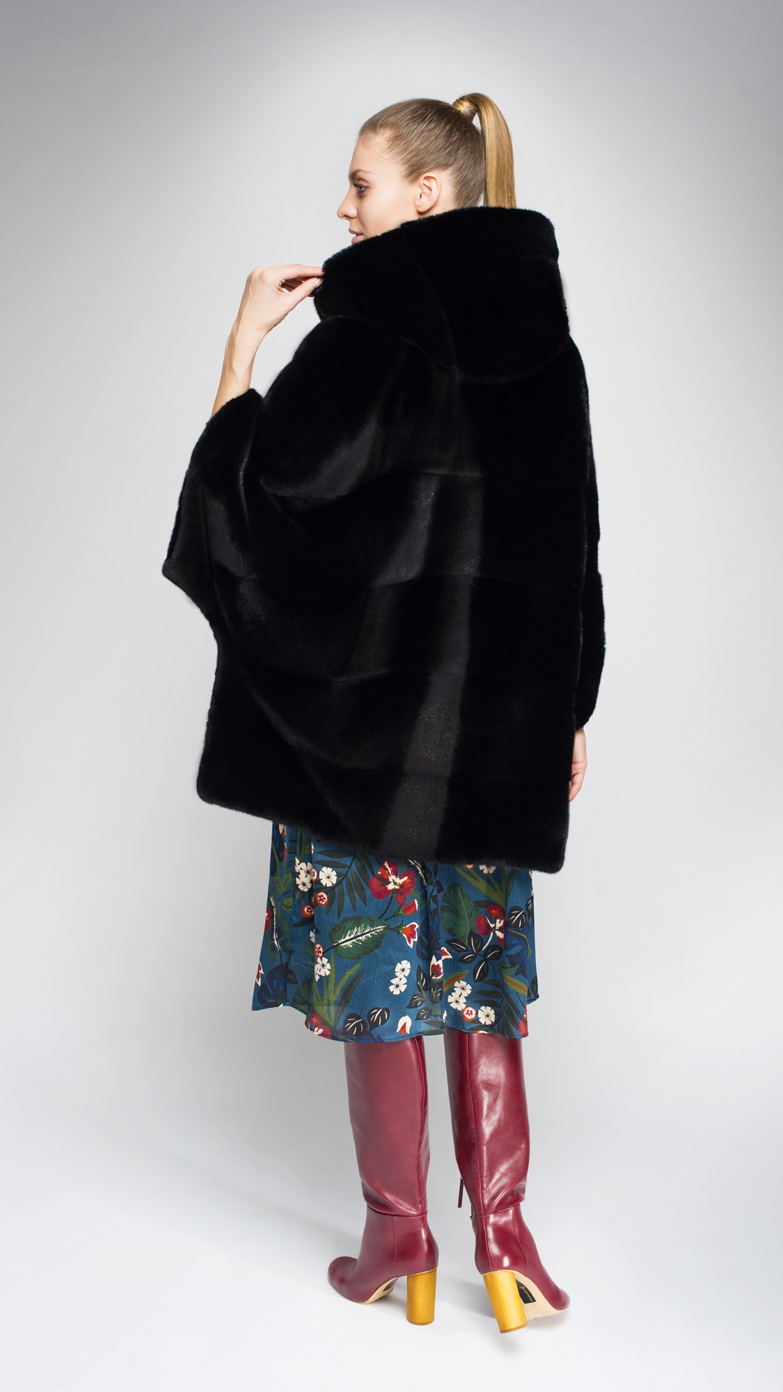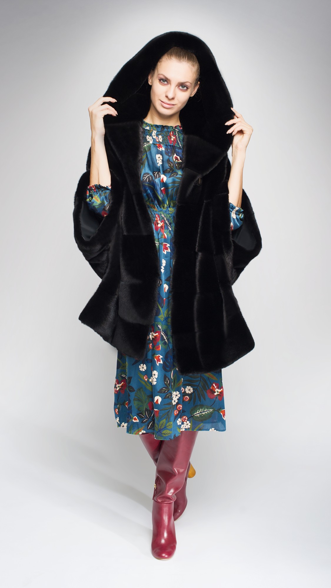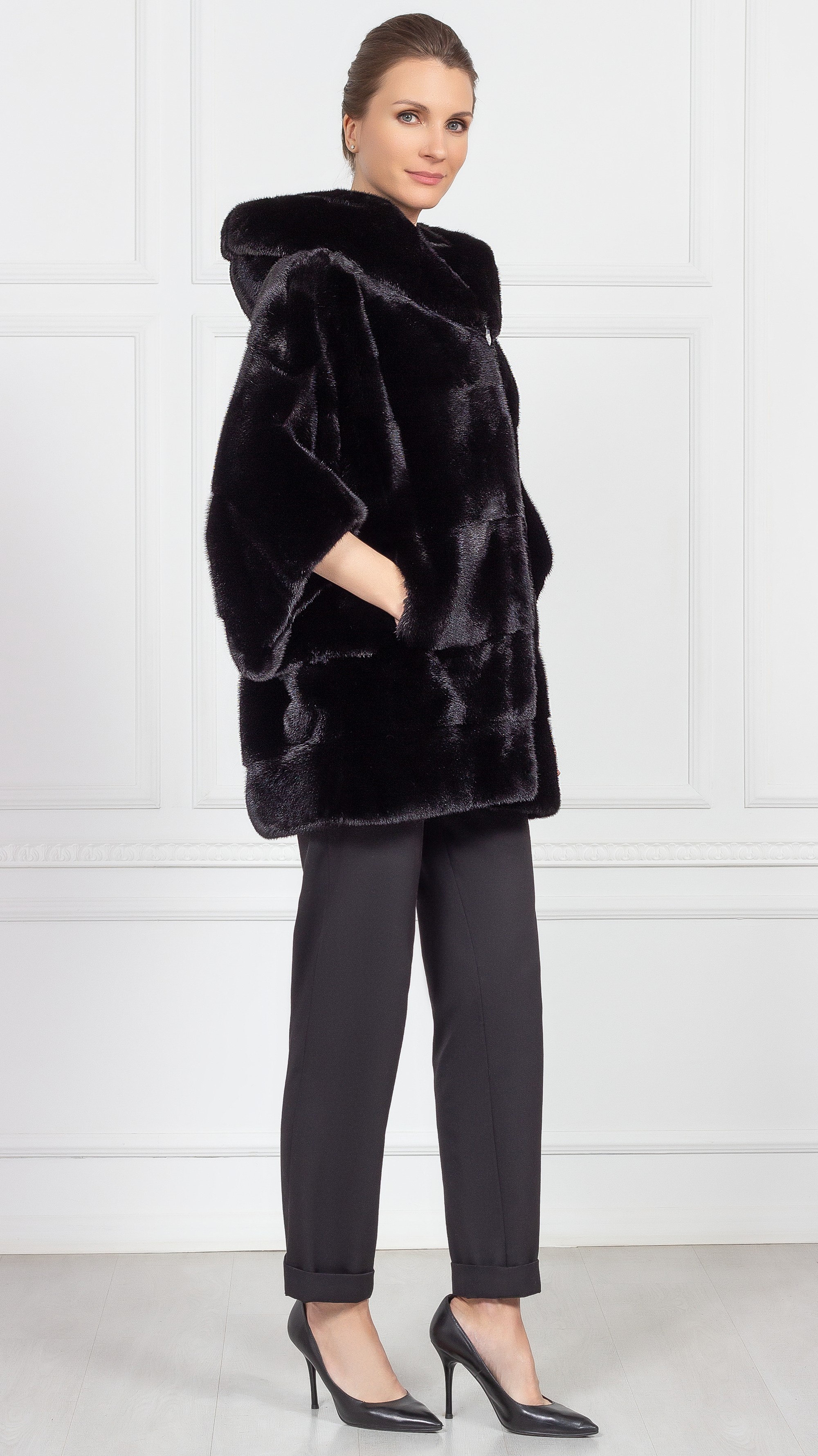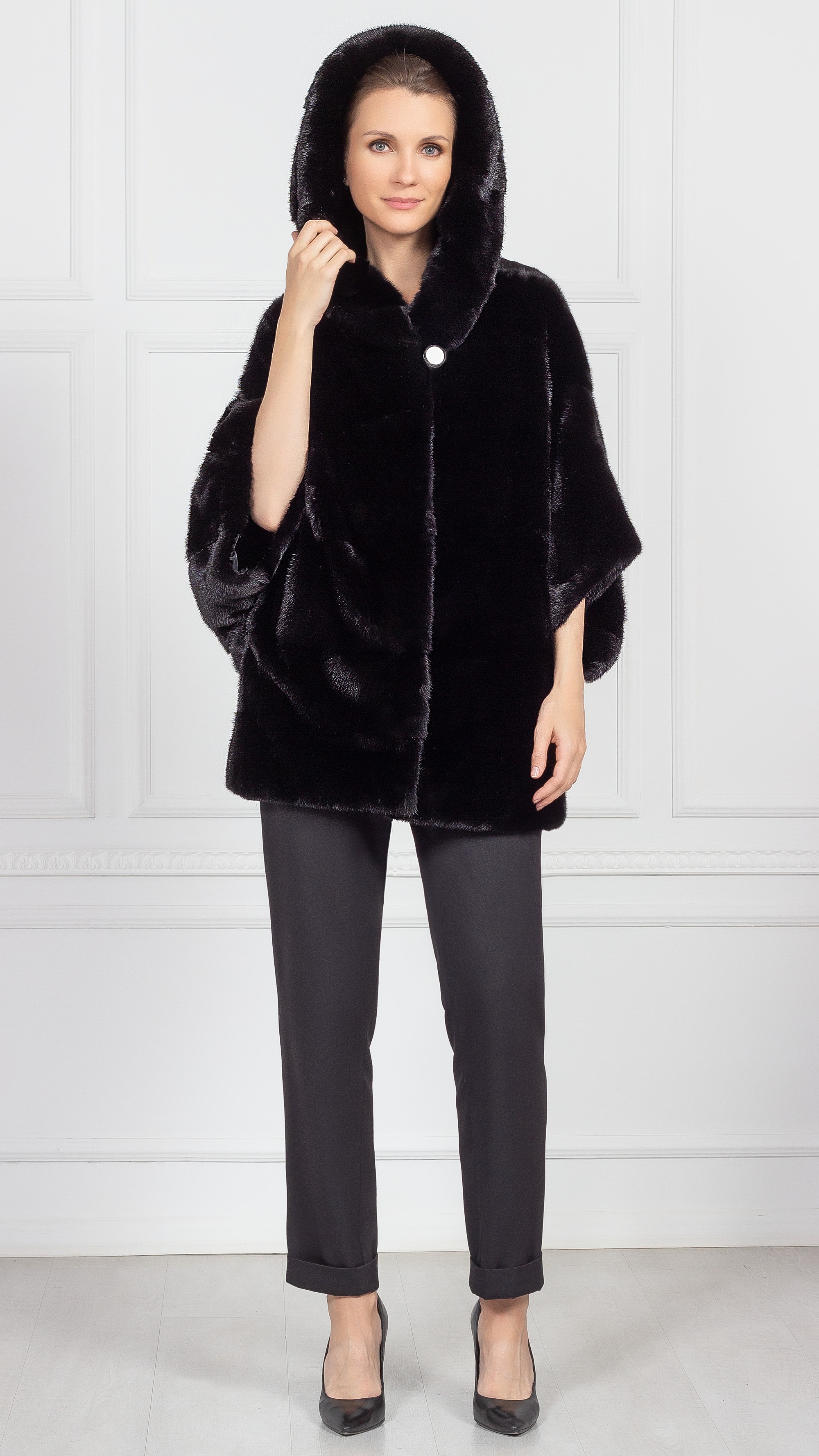Норковая шуба свободного кроя да еще и с капюшоном идеально подойдет для холодной зимы. Под нее легко надеть свитер или платье летящего кроя. Чуть укороченные рукава дополните длинными перчатками из кашемира или кожи.