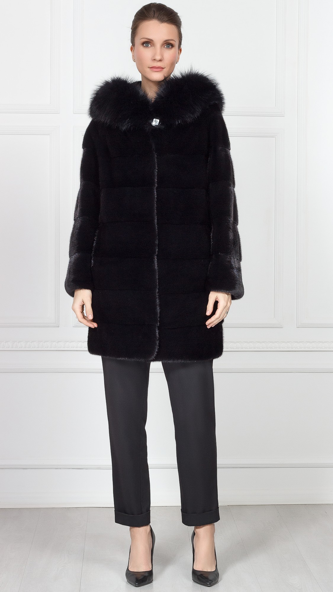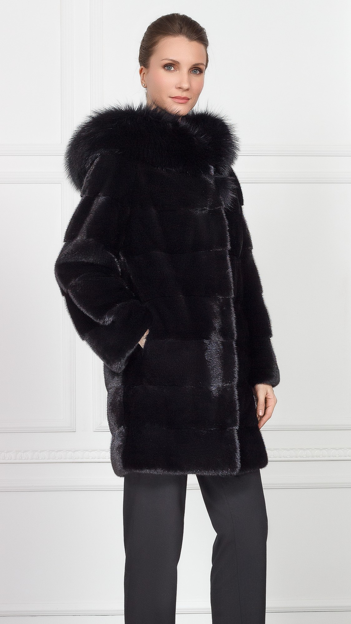 Шуба из меха норки, отделка лиса